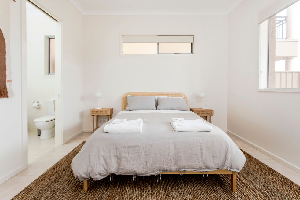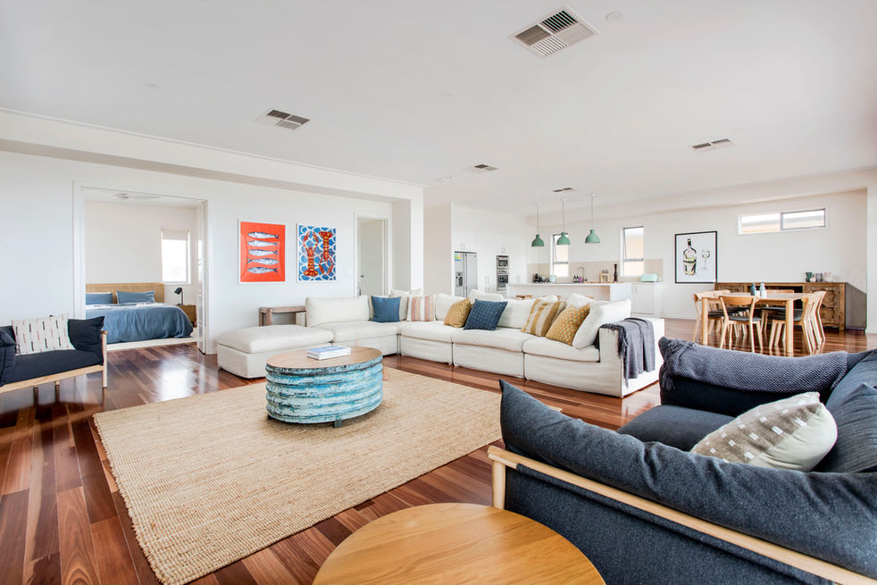 With four bedrooms, three bathrooms and two generous living spaces, the property is suitable for up to 12 persons. The upstairs level is wonderfully bright and airy, capturing spectacular, 180-degree views of the Spencer Gulf. It features a wide, open-plan space with oversized couches, an oak dining table for 12, 60” 4k Samsung TV and SONOS. The contemporary kitchen is fully equipped with a large fridge, induction cooktop and Nespresso coffee machine. For the master griller, you’ll find a BBQ on the upstairs balcony.